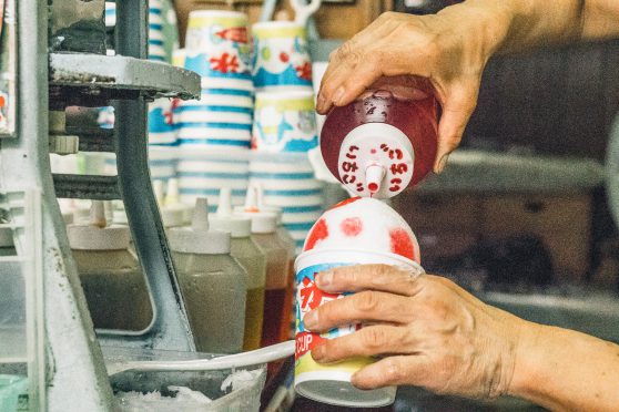 駅の近くでかき氷の旗が揺れている店があった。店の女将さんに「かき氷、やってますか?」と尋ねると「あの、ウチさ、いちご練乳しかないのよ。いい?でもね、こっからすぐの、ほらあそこに見える看板を左に曲がったところにね、天然氷を使った有名な氷屋があるのよ。しかもそっちのかき氷はウチより安くて100円。うちはほら、製氷機なのよ。ほら、いちご練乳しかないでしょ。あっちに行けば味もいろいろと選べるし。でも、あそこも有名になっちゃったから並ぶかもね。で、もし並ぶのが嫌で今すぐ食べたいというのであれば作るけど、、、。私、正直だからあっちの氷を紹介しちゃうのよ。みんなにね。うちはほら、製氷機の氷なのよ。」とかなり早口でまくしたてられた。そこまで言われると、、、ということで女将さんに礼を言い、その氷屋に向かう。教えてくれた通りに行くと噂の氷屋はすぐに見つかった。確かに並んでいるが待てない人数ではない。暑かったが、とりあえず並んだ。20分ぐらいでかき氷にありつけた。確かに100円で氷も美味しい。妻はみぞれといちご。自分はコーラとレモンのシロップを選んだ。あっという間に食べきってしまった。